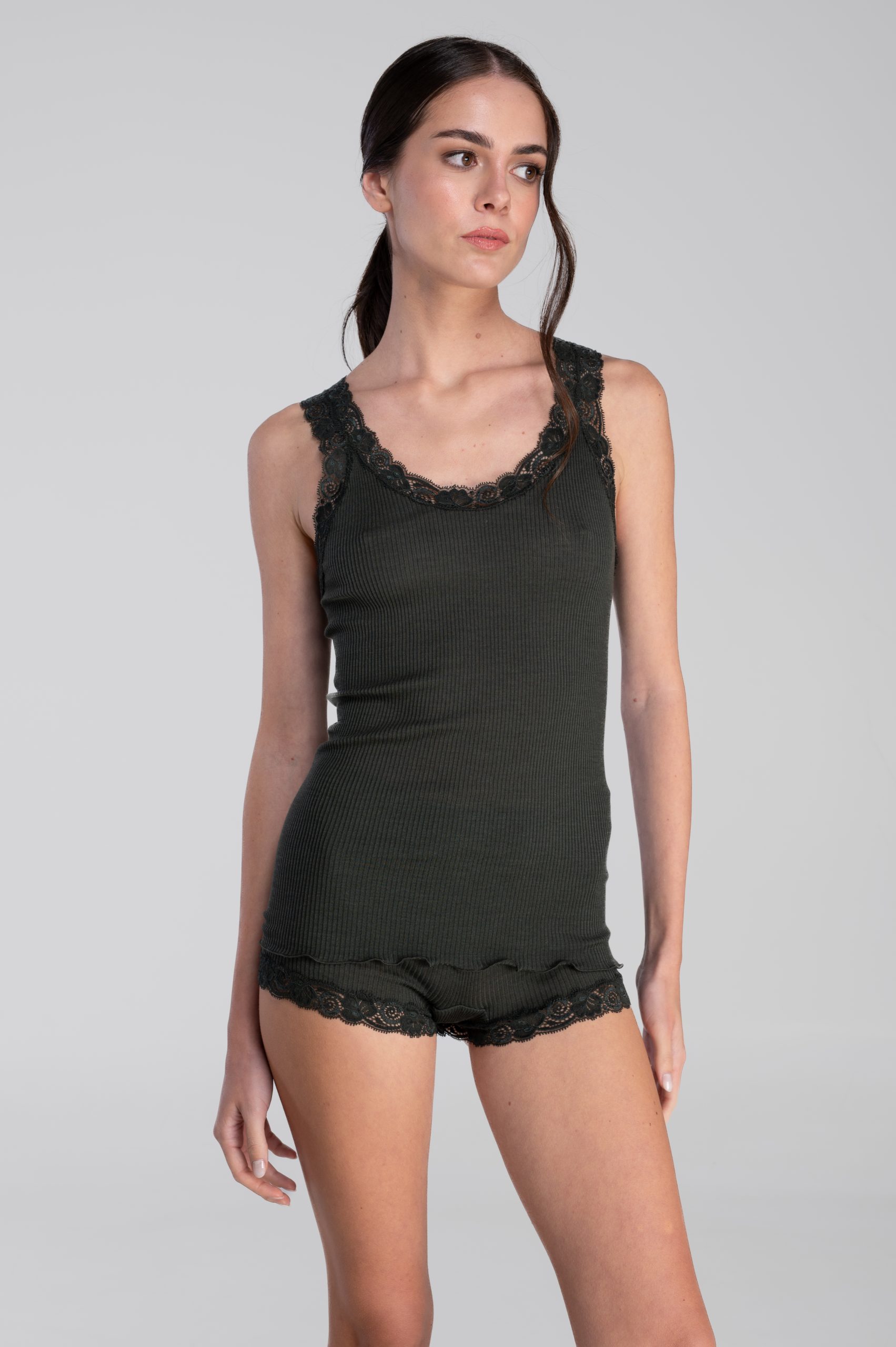 This 70% Wool and 30% Silk, rib knit tank top is a best seller and a staple piece in many closets. It has no side seams which helps prevent chafing and creates a luxurious feel when wearing it. The French leavers lace adds a refined and tasteful look. Perfect as an undershirt or on its own.